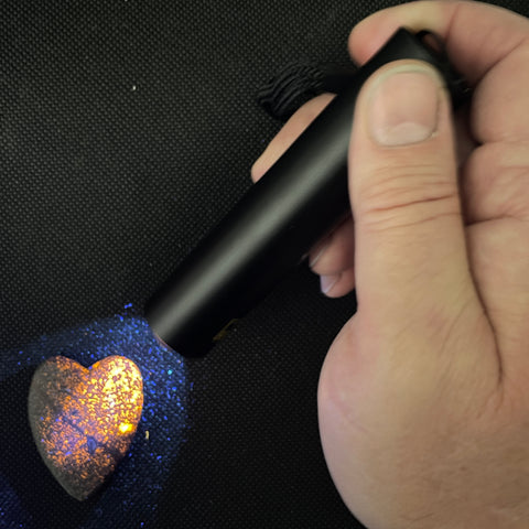 This compact 365nm long-wave UV flashlight is the same type of light I use in my studio to photograph fluorescent minerals and glowing stones. The 365nm wavelength is widely considered the optimal long-wave UV range for revealing true mineral fluorescence — far superior to cheaper “blacklight” LEDs that wash everything out with visible purple light.