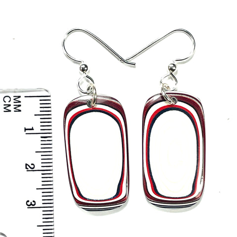 I hand cut this one of a kind pair of earrings out of genuine Fordite. Measurements in the title. Sterling silver findings. This Fordite is contemporary accumulated paint overspray from the Ford Kansas City Assembly factory in Claycomo, Missouri where they make the F150. I also have Fordite beads, cabochons, earrings, and polished face specimens in my other listings. I have material from Ford, Jeep, Corvette, MOPAR, Freightliner, and Kenworth trucks facilities!