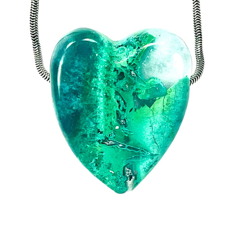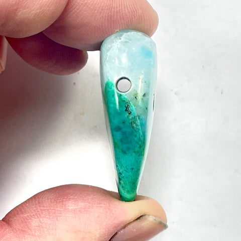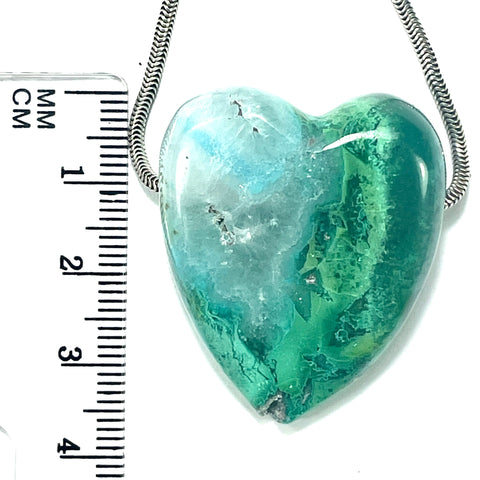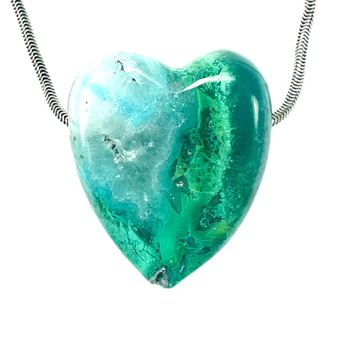 I hand-cut this one-of-a-kind heart bead from a gorgeous combination of chrysocolla and chalcedony — the kind of material some folks would call “gem silica,” though this piece isn’t fully silicated throughout. The rough most likely came from the Ray Mine in Arizona (though I can’t say that with 100% certainty), and the stone has a beautiful, soothing presence. At the very tip of the heart you’ll find a tiny natural vug lined with delicate druzy crystals, adding sparkle and dimension.