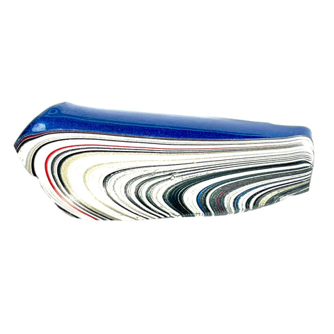 My journey with Fordite dates back to the 1970s when I was actively involved in our local rock club in Michigan. Back then, dedicated rockhounds employed in the auto industry would salvage chunks of dried, layered car paint from factory painting booths, a practice dating back to the late 1960s. This overspray paint, subjected to repeated baking in curing ovens, gained remarkable hardness and solidity. It was affectionately known then by various names such as "Fordite, Chryslerite, Buickite, Detroit Agate," but over the years Fordite has become the most widely recognized and cherished term. Today, Fordite has evolved beyond its novelty origins to become a sought-after faux gemstone. Explore my collection and discover the rich history and unique beauty of genuine Fordite.