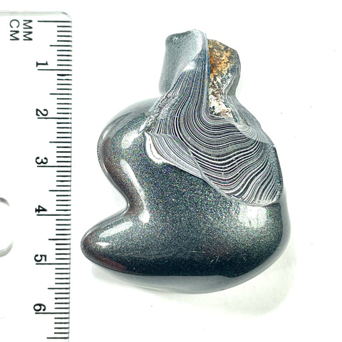 I made this polished face specimen out of genuine fordite . It is contemporary accumulated paint overspray from a MOPAR factory in SE Michigan that makes parts for Chrysler/Dodge/Jeep/Ford vehicles. Use the image next to the ruler for size reference in millimeters. Shipped in a gift box with a certificate of authenticity.
