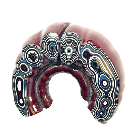 I have over four decades of experience crafting unique Fordite pieces. Contrary to the long-held belief that new Fordite rough is nearly impossible to find due to modern manufacturing changes, there is still some contemporary material available to lapidary artists like myself. My collection comes from a very small number of trusted, reputable dealers whose material I have known for years, ensuring authenticity and proper provenance. When considering Fordite, it is essential to distinguish genuine material from the many imitations now flooding the market—resin blends, layered paints, and mass-produced composites with no true automotive history. I stand firmly behind the authenticity of every piece I create.