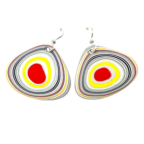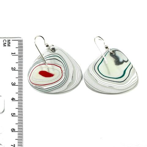 I hand cut this one of a kind pair of earrings out of genuine Fordite.  Measurements in the title.  Sterling silver findings, CHAIN NOT INCLUDED.  This Fordite is contemporary accumulated paint overspray from the Ford Kansas City Assembly factory in Claycomo, Missouri where they make the F150.   I also have Fordite beads, cabochons, earrings, and polished face specimens in my other listings.  I have material from Ford, Jeep, Corvette, MOPAR, Freightliner, and Kenworth trucks facilities!