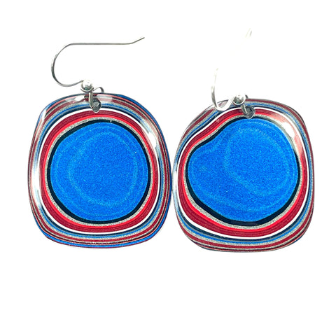 I hand cut this one of a kind pair of earrings out of genuine Fordite.  Measurements in the title.  Sterling silver findings, CHAIN NOT INCLUDED.  This Fordite is contemporary accumulated paint overspray from the Ford Kansas City Assembly factory in Claycomo, Missouri where they make the F150.   I also have Fordite beads, cabochons, earrings, and polished face specimens in my other listings.  I have material from Ford, Jeep, Corvette, MOPAR, Freightliner, and Kenworth trucks facilities!