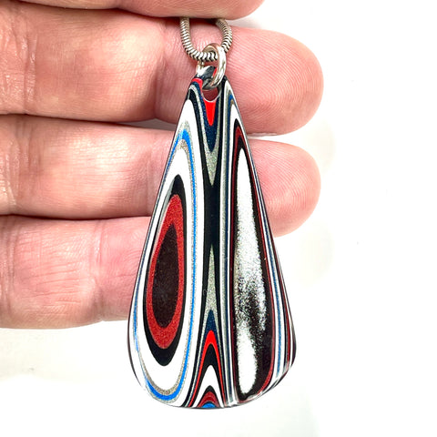 Fordite is accumulated overspray from paint booths of an auto factory which I cut and polish using traditional lapidary techniques.  This is not finished jewelry but it is lightweight and could be worn on a chain or leather cord, strung with complimentary beads, wire wrapped, or enjoyed as is. In my other listings I have Fordite beads, pendants, earrings, cabochons, and polished face specimens made with other varieties of Fordite as well, including material from Corvette, Kenworth, F150, JpWrnglr, Freightliner, and more!