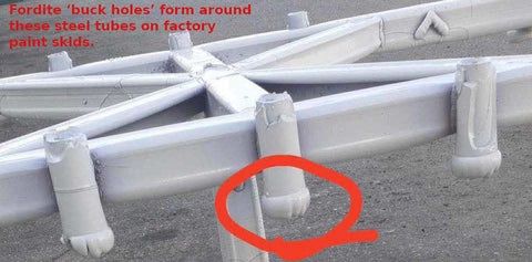 This piece is a rare example of a Fordite “Buck Hole.” Buck holes form around the steel tubes mounted to paint skids inside automotive paint facilities. These tubes hold the fixtures—called bucks—that support parts as they travel through multiple paint booths and curing ovens. Over years of repeated spraying and baking, thick layers of paint accumulate around these cylinders, forming dense, donut-shaped masses of Fordite. Only a few buck holes form on each skid, and many break during removal, making intact examples especially uncommon. Pieces that survive whole are polished into striking donut beads, while more fragile ones are finished as polished-face specimens. Buck hole Fordite is prized for its bold concentric patterns, industrial origin, and rarity—an unmistakable record of the machinery that carried automotive history through the paint line.